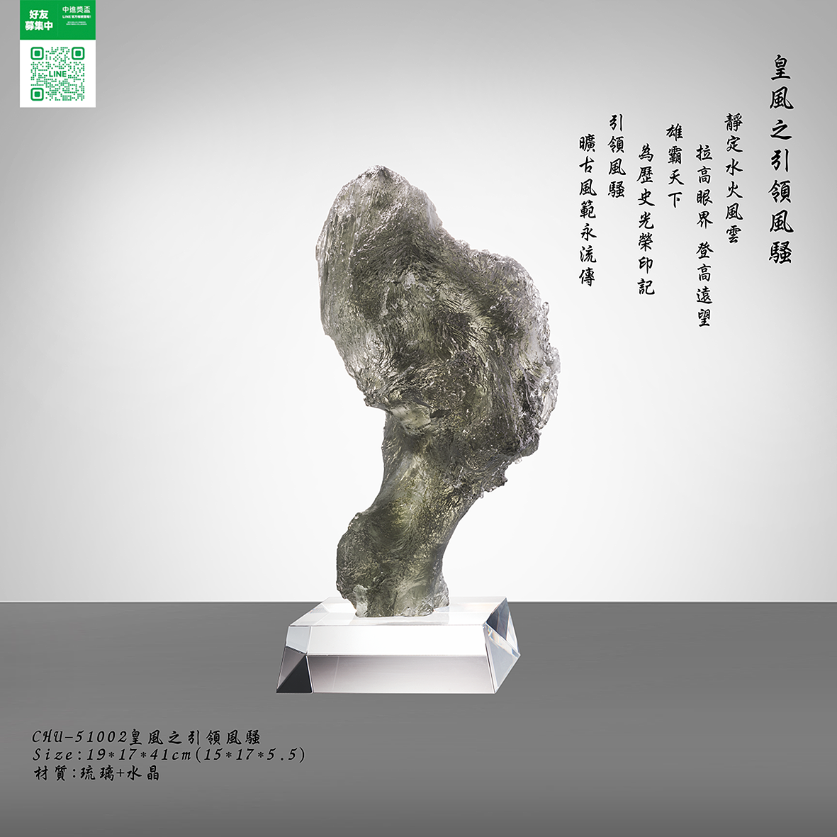 尺寸: 19*17*41 CM 材質 : 琉璃+水晶 內容 : 含雕刻字+上金+錦盒+提袋